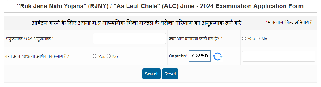 - On clicking the Rjny Jun – 2024 Examination Application Form link, MP Ruk Jana Nahi Yojana Examination Form for class 10th and 12th students will open:-